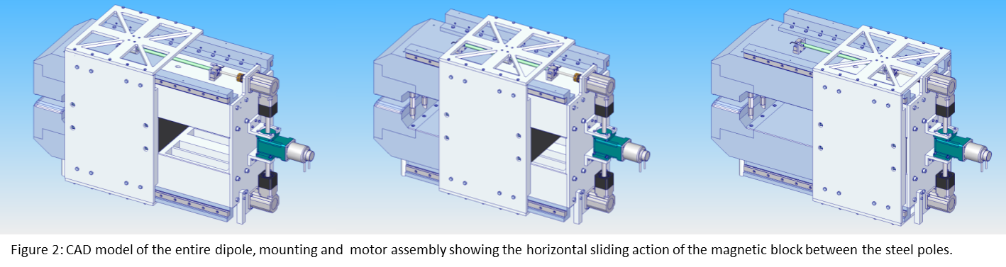 In 2016 we completed the mechanical design and purchased the magnetic material for the dipole prototype (figure 3). Modelling shows that our design should be capable of producing a field that varies from 1.1 to 0.45 Tesla by moving the block 400 mm away from the beam pipe. The motor assembly must overcome a highly varying force of up to 27 kN to move the block and must hold it in place. If we instead changed the field by pulling the poles directly apart, the motor would need to overcome a force of 165 kN, or the weight of three elephants, on each pole!